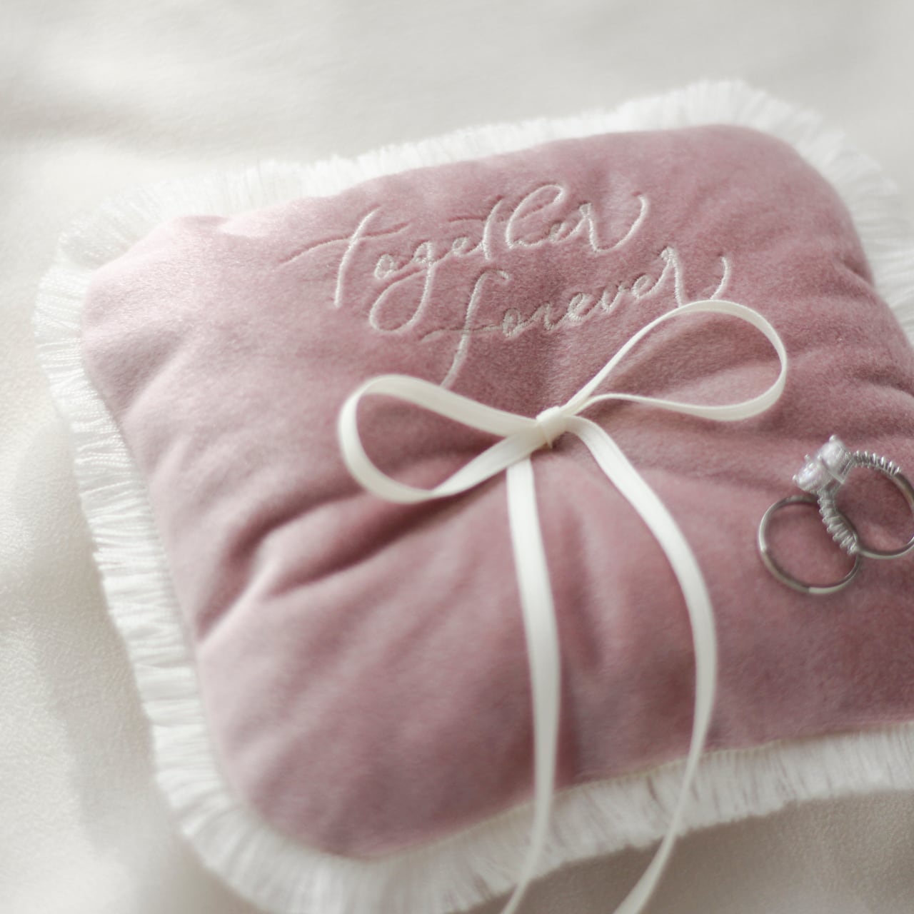 Our original design features the message ‘together forever,’ embroidered from hand-drawn calligraphy.