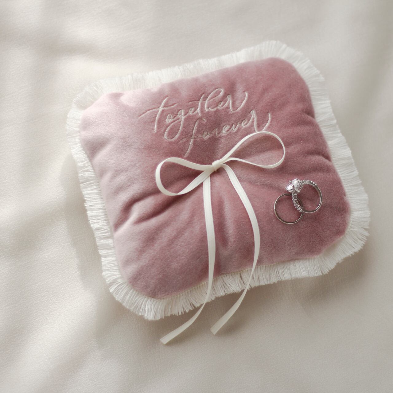 A soft, fluffy cushion tenderly embraces the rings.