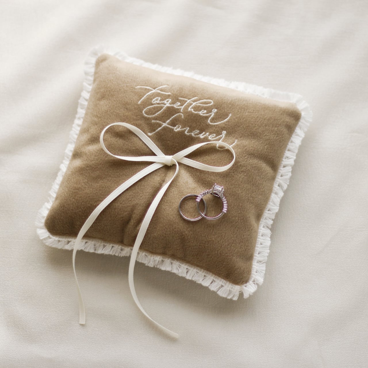 A soft, fluffy cushion tenderly embraces the rings.