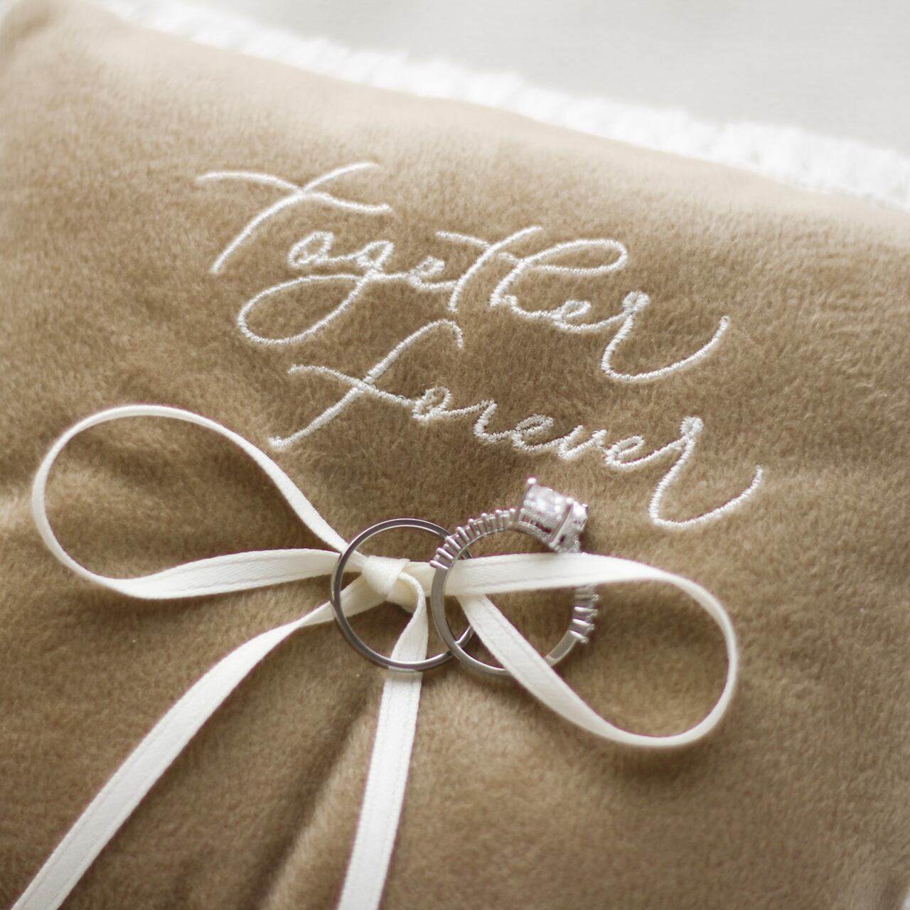 Our original design features the message ‘together forever,’ embroidered from hand-drawn calligraphy.