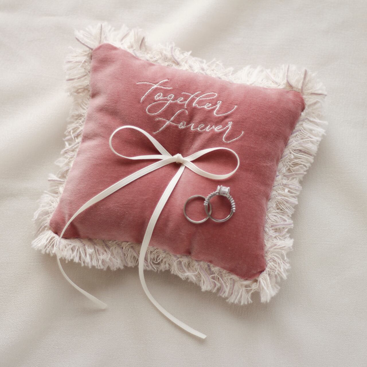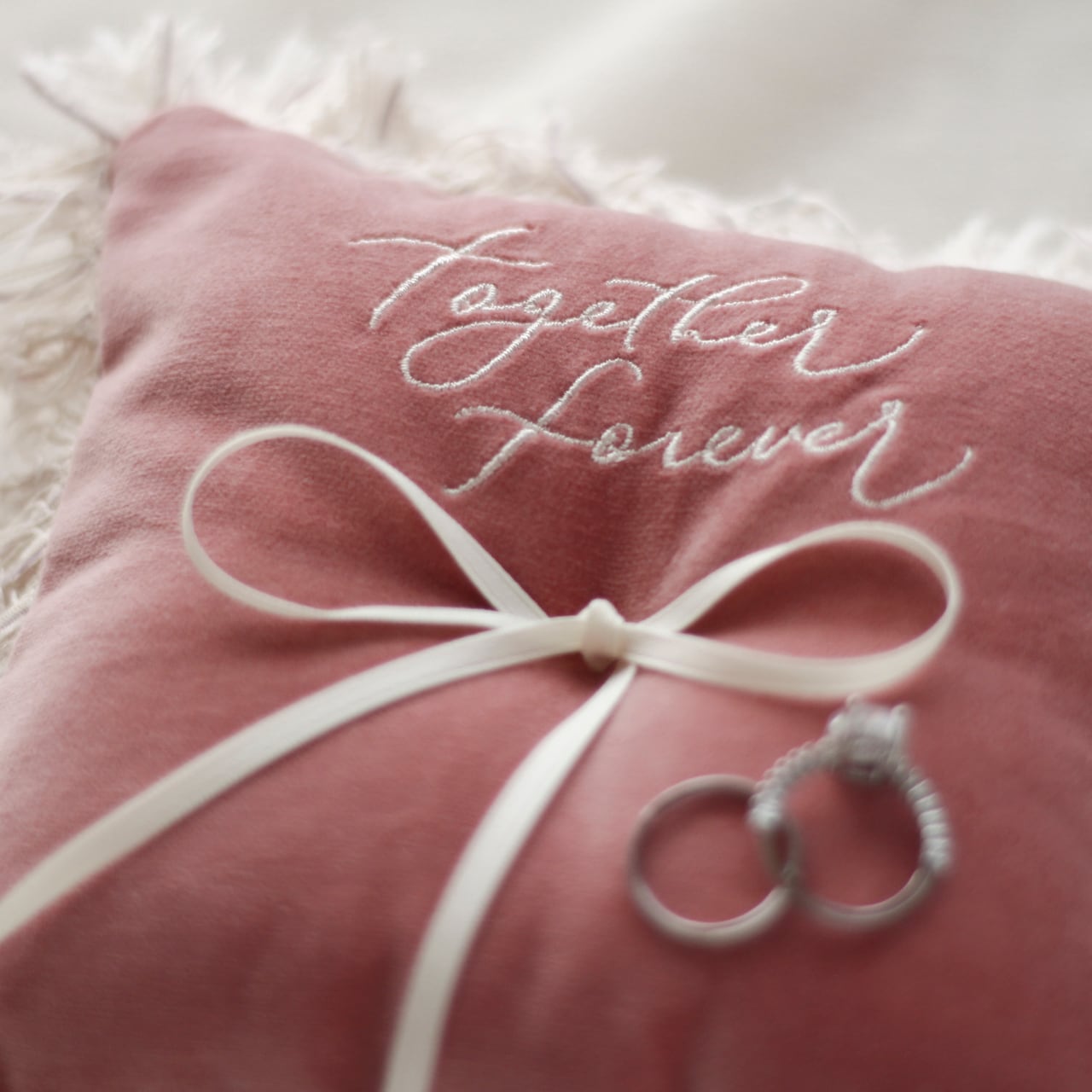 A soft, fluffy cushion tenderly embraces the rings.